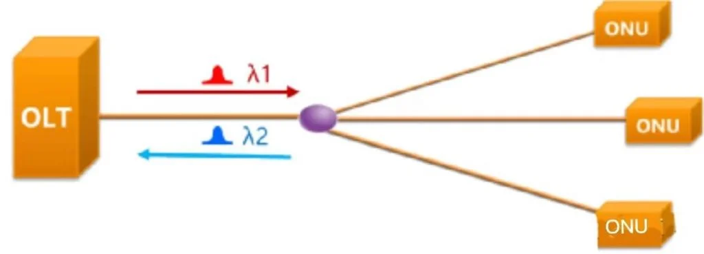 The other is to use a single fiber for bidirectional transmission, namely single fiber bidirectional PON, in order to save fiber and reduce maintenance costs. At this time, two wavelengths need to be used. λ1 is used for uplink transmission, and λ2 is used for downlink transmission (as shown in the figure below). The capacity of each wavelength channel can be flexibly allocated among ONUs through time slot sharing.