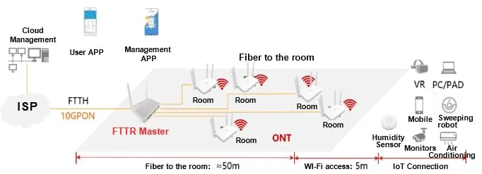 FTTR (Fiber to The Room) fiber deployment to the room design solution is a solution based on FTTB (Fiber to the Building) and FTTH (Fiber to the Home), so that each room can reach more than a gigabit network speed, to achieve full coverage of the whole house wired and Wi-Fi dual gigabit.