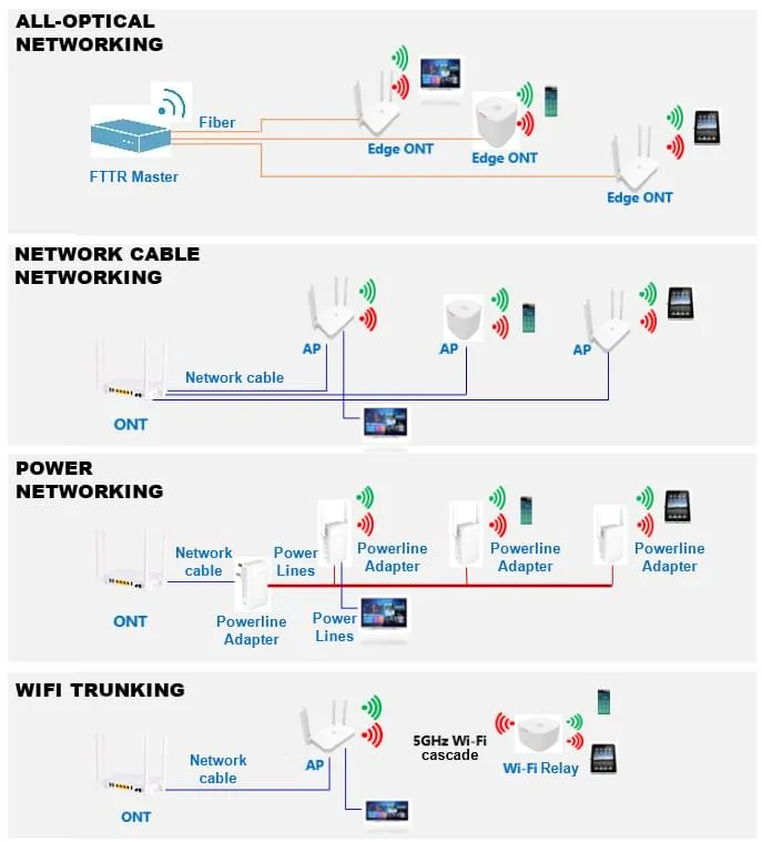 All four deployment schemes are based on different transmission media and transmission protocols, and their transmission bandwidth and stability are different. Wi-Fi relay networking based on 802.11 protocol is subject to large environmental interference, rapid fading and poor stability; Powerline Adapter networking based on G.hn protocol, its link sharing mechanism leads to serious deterioration of multi-device networking performance and is not suitable for large bandwidth data transmission; Ethernet protocol-based network cable networking relies heavily on the quality of network cables, and the current indoor Most of the pre-buried wires are Category 5 wires, making its transmission rate only up to 100Mbit/s, which cannot experience the application of high speed demand; while the all-optical networking method based on PON protocol uses optical fiber as the only transmission medium, with mature operation and maintenance protocols, high reliability, and a stable return bandwidth of more than 1G, which is the optimal choice for future communities and future families.