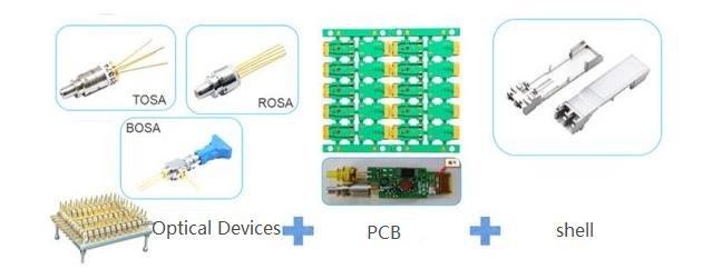 In fact, to be precise, the optical module is composed of three parts: an optoelectronic device (TOSA,ROSA,BOSA), an optical interface (housing) and a PCB board. Secondly, its role is to convert the electrical signal from the transmitter into an optical signal, after transmission through the optical fiber, the receiver then convert the optical signal into an electrical signal, simply put is the electronic components of photoelectric conversion.